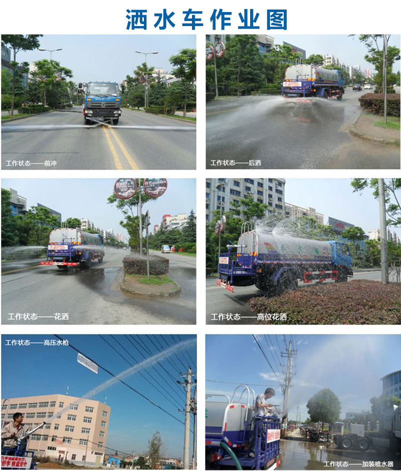 灑水車專用功能: 垂直吸程>6米,灑水寬度>14米,射程>28米。灑水車前沖(能將路面泥巴、塵土、垃圾沖干凈);后灑(能均勻地將水灑在路 面,一次灑水寬度>14米)、前側(cè)噴(花灑)(能均勻地將路旁綠化帶澆灌)、帶后工作平臺,平臺上安裝綠化灑水高炮(炮有大雨、中雨、毛毛雨、霧狀 可調(diào)節(jié))。配備全國質(zhì)量領(lǐng)先的大功率專用灑水泵,引水時(shí)間 <5分鐘,流量 90立方/小時(shí) 。 帶消防接頭,帶自流閥,帶自吸功能。